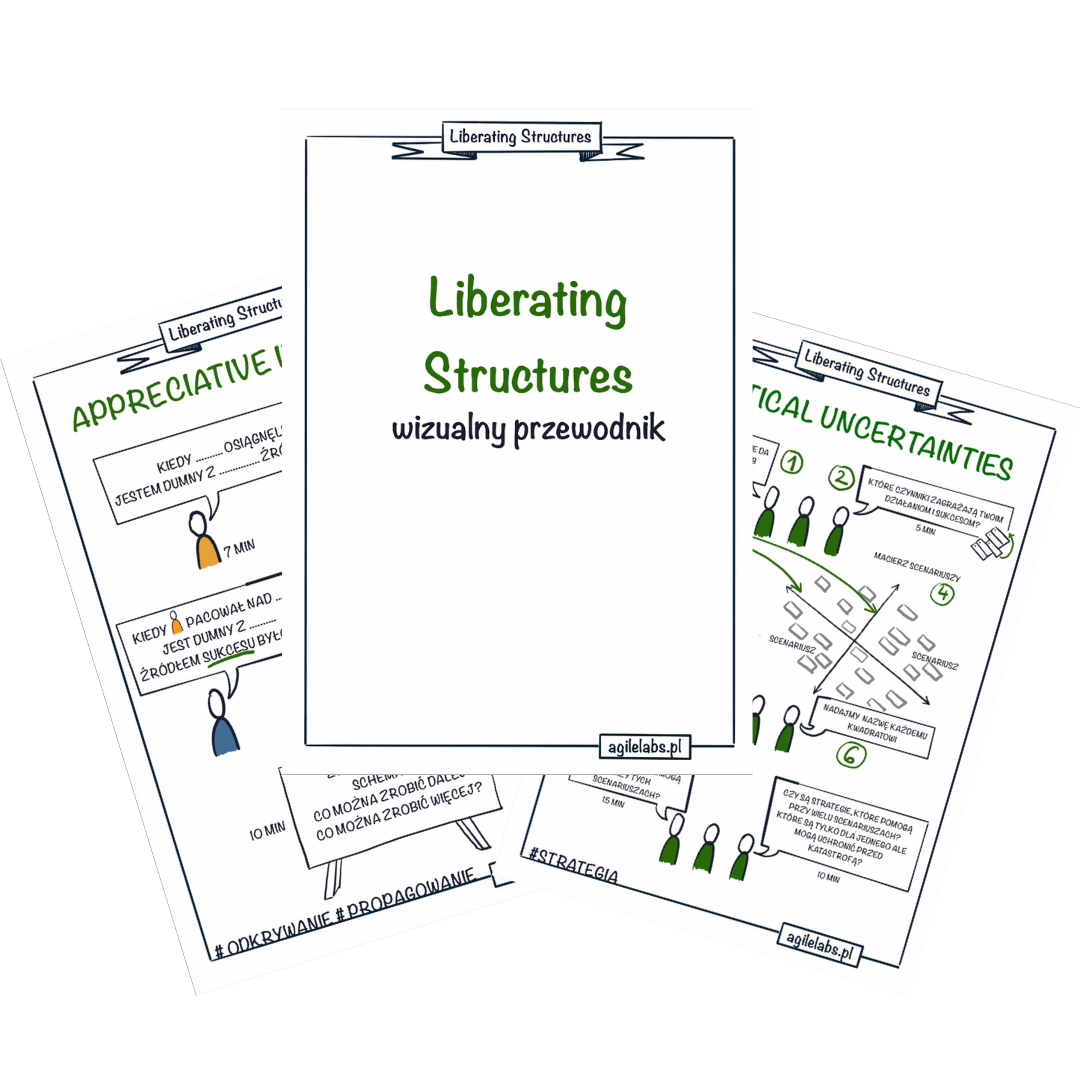 Pobierz za darmo rysunkowy przewodnik po Liberating Structures i odkryj, jak wciągnąć wszystkich do rozmowy oraz szybciej dochodzić do lepszych rozwiązań.