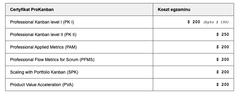 W ProKanban znajdziesz certyfikat o 1 lub 2 poziomach. Nie jest wymagane uczestnictwo w szkoleniu i można samodzielnie podejść do egzaminu w każdej chwili. Egzamin Professional Kanban I (PK I) składa się z 80 pytań, na które trzeba odpowiedzieć w 60 minut uzyskując min. 85% prawidłowych odpowiedzi (dla innych egzaminów te wartości są inne). Aby chronić integralność procesu certyfikacyjnego, ProKanban.org nie udostępnia informacji o konkretnych pytaniach, na które udzielono poprawnych lub niepoprawnych odpowiedzi.
