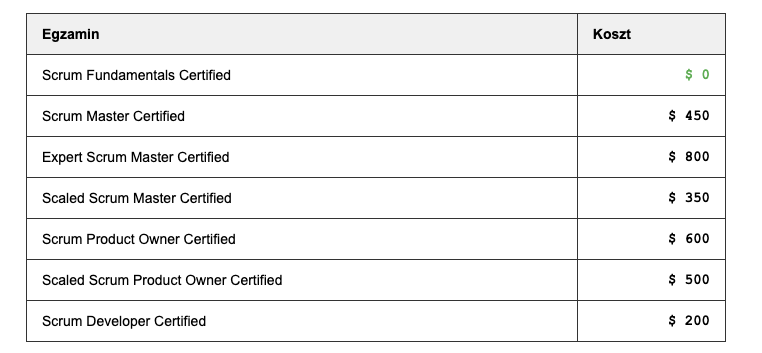 Dlatego przygotowałem dla Ciebie takie zestawienie. Znajdziesz tam linki do każdej organizacji/firmy oferującej szkolenie z każdej wymienionej w tekście „stajni Agile” 😉 i co najważniejsze aktualne ceny poszczególnych szkoleń