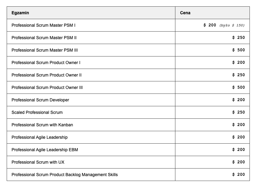Aby było Ci łatwiej w poszukiwaniach przygotowałem zestawienie wszystkich kursów, szkoleń przygotowujących do egzaminów Scrum.org. Znajdziesz tam zestawienie wszystkich osób/firm, które oferują szkolenia, bezpośredni link do oferty oraz co chyba najważniejsze 😉 ceny kursów.