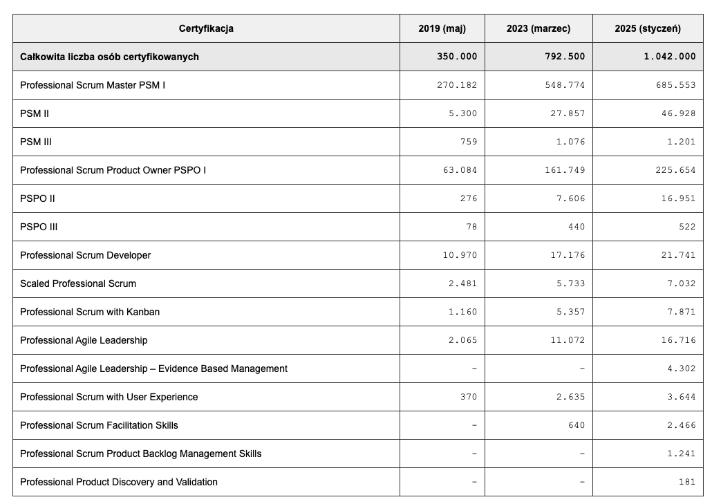 Scrum.org jest od lat najbardziej popularnym certyfikatem w Polsce. Na całym świecie liczba osób które uzyskały któryś z tych certyfikatów przekroczyła w grudniu zeszłego roku 1.042.000 osób. Całkiem okrągła liczba 🙂
